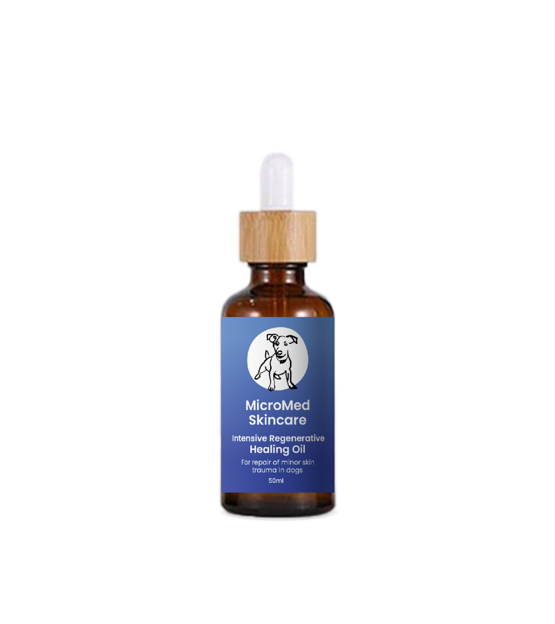 Our Intensive Regenerative Healing Oil provides a protectant barrier for the skin to remedy skin trauma and repair cracked, damaged and flaking skin. For best results, use this product alongside Micromed Probiotics for Dogs.